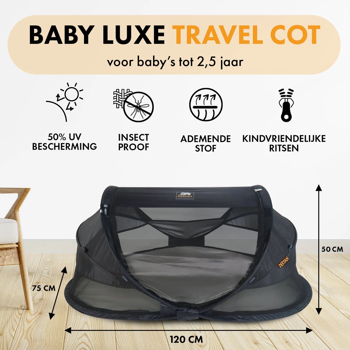 Gebruiksvriendelijkheid en kwaliteit staan in een hoog vaandel bij de DERYAN-familie. De materialen waarmee de DERYAN Baby Luxe gemaakt is, zijn brandvertragend en 50% UV-bestendig.