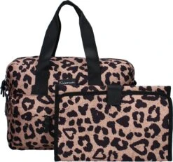 Ga je met een baby op pad? Dan moet je heel wat meenemen. Als ouder kan je daarom niet zonder een goede luiertas. In deze luiertas met panterprint uit de Gorgeous collectie van Kidzroom passen alle luiers, hydrofiele doeken, extra kleding, flesjes, hapjes en speentjes die je onderweg voor je baby nodig hebt. De tas heeft twee ruime voorvakken voor de spulletjes die je even snel wilt kunnen pakken. Daarnaast is het grote hoofdvak voorzien van een dubbele rits, waardoor je overal makkelijk bij kunt. De tas is voorzien van een verschoonmatje voor je baby. De luiertas draag je mee aan de handvatten aan de bovenkant of over je schouder middels de verstelbare en afneembare schouderband. Door middel van de ophanglussen kun je de luiertas ook gemakkelijk ophangen aan de kinderwagen.