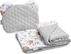 De set bevat een heerlijk kussen met teddybeeroren en een dekbed met een fijne vulling met siliconenfleece. De dubbelzijdige set is gemaakt van hoogwaardige materialen – kleurrijk katoen en een zeer mooie fluwelen stof die elke baby zal troosten. De set is perfect voor een kinderwagen, ledikant, wieg of als matje voor een baby. Het kussen zelf kan als knuffel worden gebruikt. De hoge kwaliteit van de afwerking wordt benadrukt door een esthetische inzet
