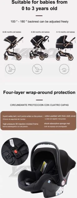 Je kindje kan heerlijk genieten van een wandeling in de 3-in-1 kinderwagen door de zacht gewatteerde zitting. Ook op warme dagen met veel zon ben je goed voorbereid met de uittrekbare zonnekap en ventilatie vensters. De rugleuning en voetensteun kunnen helemaal plat worden ingesteld en bieden je kindje de mogelijkheid om rustig te slapen. Op die manier kan je de reis op je eigen tempo voortzetten.