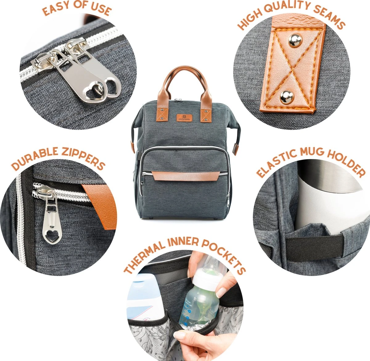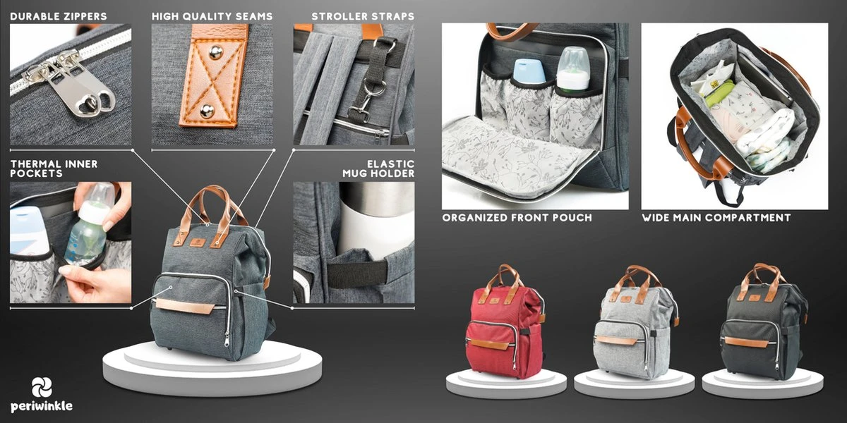 Periwinkle mommy bag heeft stevige en geteste naden. De handvatten en de aan de achterkant bevestigde naden zijn extra verstevigd en ontworpen voor langdurig en voortdurend gebruik. Je kunt hem de komende jaren gebruiken als babytas of als reisrugzak.