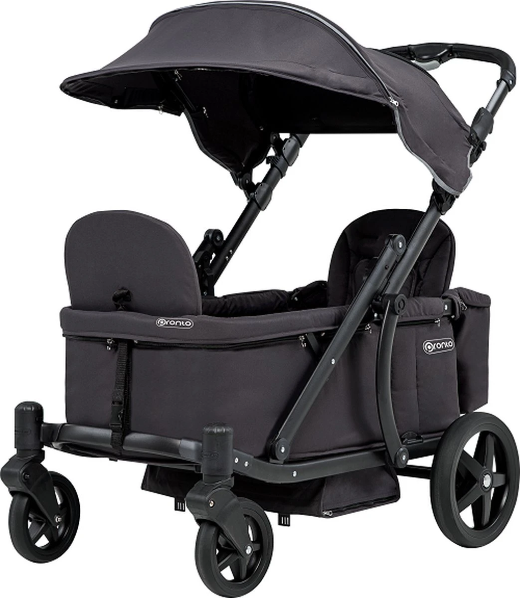 De Pronto stroller is een luxe kinderwagen/bolderkar met brede wielen. Hij kan alle harde en oneffen terreinen aan, zelfs zand. Er zijn 2 speciale stoelen met een 5-punts gordel, maar in een mum van tijd kunnen 3-4 kinderen samen in de Pronto zitten. De Pronto kan bij een baby voornamelijk als wieg worden gebruikt. Oudere broers en zussen kunnen aan de andere kant zitten. Daarnaast kun je je eigen tas en spullen ook kwijt in handige opbergvakjes en kun je de Pronto extra aankleden naar eigen behoefte.