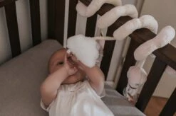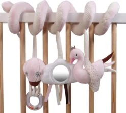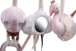 De boxspiraal bestaat uit een zwaan Ivy knuffeltje met gouden stippen rokje, een pluche wolkje met spiegel en labels én een luchtballon als rammelaar! Genoeg activiteiten om je kindje te stimuleren om ernaar te grijpen en lekker mee te spelen.