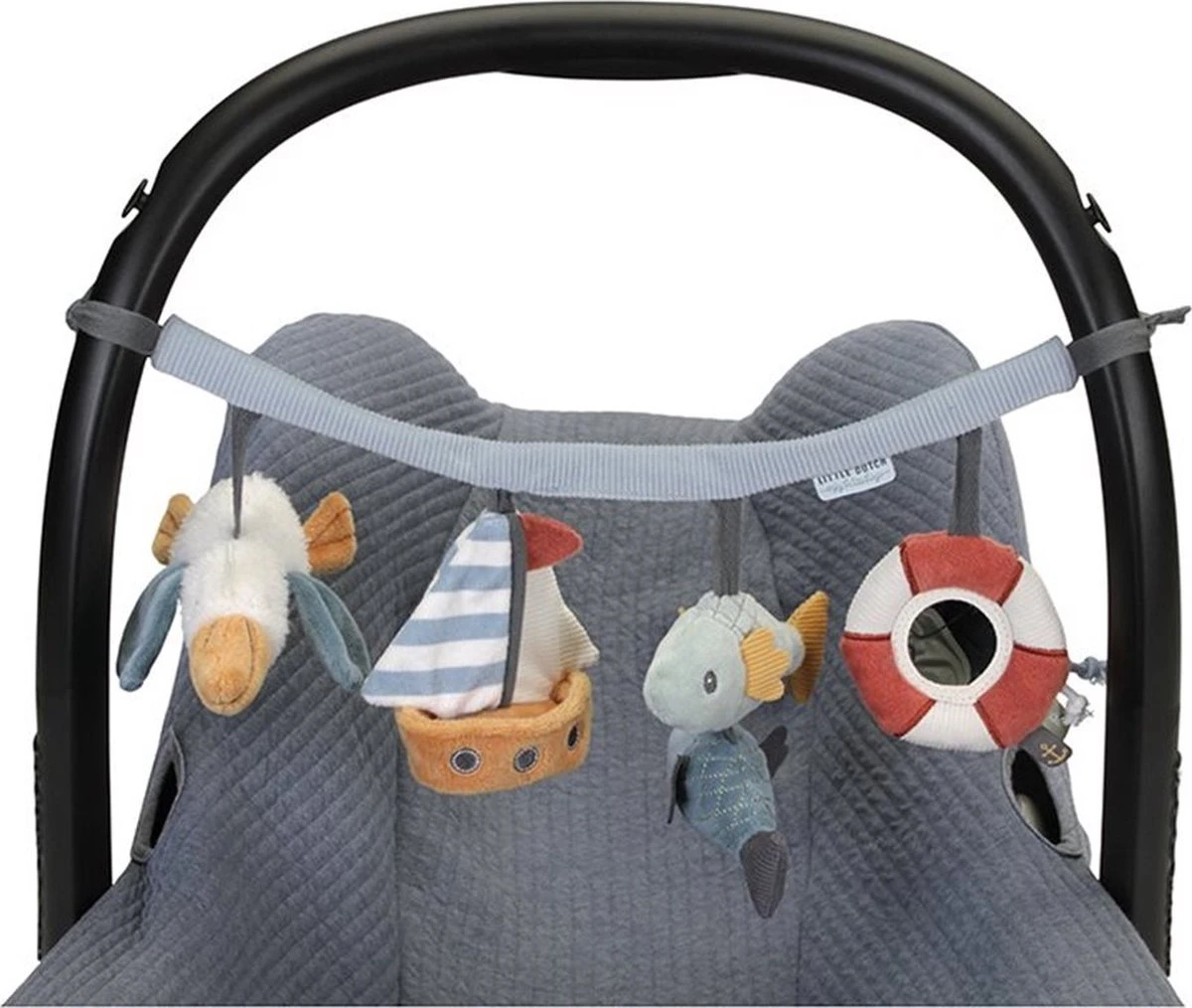 Wagenspanner Sailors Bay is eenvoudig te bevestigen aan een autostoeltje of kinderwagen en zorgt onderweg voor veel speelplezier. De wagenspanner heeft 4 speeltjes: een rammelaar, spiegeltje, knijptoetertje en knisperspeeltje, die de hand-oogcoördinatie stimuleren.